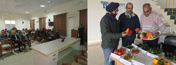 A training programme for farmers on protected cultivation for vegetable crops was organized by Centre of Excellence for Vegetables, Kartarpur on 12.1.2017. Dr BVC Mahajan, Director, Punjab Horticultural Postharvest Technology Centre, PAU Ludhiana delivered a lecture on postharvest handling of vegetable crops. He discussed the importance of grading, packaging and storage for reducing the postharvest losses of horticultural perishables. He told the farmers to formulate self-help groups/cooperative societies and target different markets for the marketing of vegetable and fruit crops.
