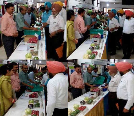 Dr Baldev Singh Dhillon, Vice Chancellor, Punjab Agricultural University Ludhiana alongwith Dr P.S. Aulakh, Director of Horticulture, Punjab visited the PHPTC stall during Research and Extension specialists' workshop of Vegetables, Floriculture and Sericulture on 31-5-2017. The dignitaries interacted with the scientists of the centre. Dr BVC Mahajan Director, PHPTC explained that scientists of the centre designed a plastic crate (10 Kg ) for tomato and also developed the protocol for drying of bitter gourd slices. Both the technologies have been approved by Research Evaluation Committee of PAU.