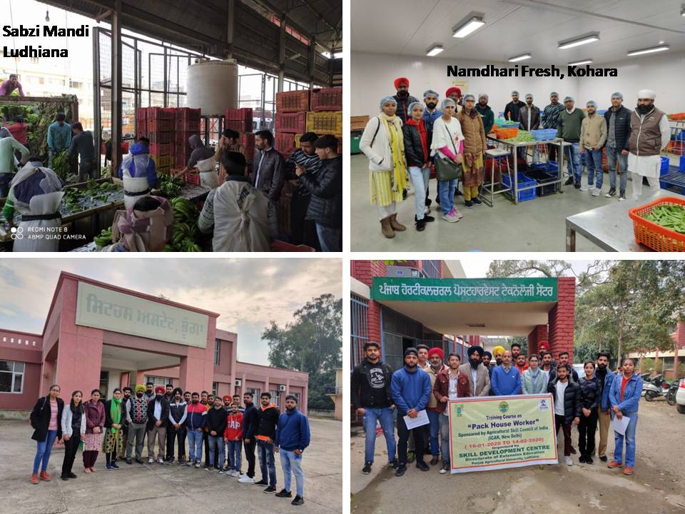 Training program on Packhouse Worker was conducted in collaboration with Skill Development Centre, PAU, Ludhiana sponsored by Agricultural Skill Council of India, New Delhi from 16.01.2020 to 14.02.2020. A total of 20 candidates from different regions of Punjab state participated in the training program. The program emphasized on working operations of pack-house of fruits and vegetables with respect to sorting, grading, packaging and storage. Hands-on-training was given to participants on packaging techniques of fruits and vegetables for retail marketing. Different processing technologies were also discussed and hands-on-training was also provided for value addition to fruits & vegetables. During the training program exposure visits were conducted at Citrus Estate, Bhunga to demonstrate pack-house operations of kinnow fruit, Salem Tabri Sabzi mandi, Ludhiana for exhibiting ripening of bananas using ethylene gas, Namdhari Fresh Foods, Ludhiana for packhouse operations of vegetables and Centre of Excellence for Vegetables Kartarpur. The course was conducted under the Technical guidance of Dr. BVC Mahajan, Dr. T S Riar, Dr. Swati Kapoor and Dr. Lavleesh Garg.