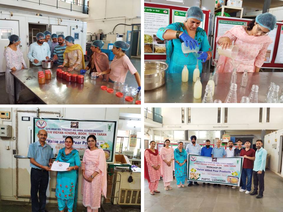 A training program on postharvest handling and value addition of pear fruits was organised by Punjab Horticultural Postharvest Technology Centre, P.A.U. Ludhiana in collaboration with KVK, Booh, Tarn Taran. Dr BVC Mahajan Director informed that pear is an important fruit of Punjab growing commercially in Amritsar and Tarn Taran districts. The Punjab Government has established Pear Estate in Amritsar district to boost the production of pear fruits and its marketing in domestic and distant markets of India. The harvesting period of pear July to September coincides with monsoon rains leading to glut in the market and huge postharvest losses. Dr Mahajan elaborated that this fruit has good storage potential and can be stored for 6-8 weeks in cold storage. These stored fruits can be marketed to other states during off-season. Secondly, processing could be another way to diversify its use and earn profit from its processed products. Dr. Swati Kapoor, Food Technologist provided hands-on-training to the farmers for preparation of pear jam, pear bar, pear juice and pear squash. As such processed pear products are not available in the market, therefore, progressive farmers of this region wanted to explore storage and processing potential of pear crop. These technologies could help minimizing the postharvest losses of this premium fruit and popularize use of pear fruit in its processed form in the local and inter-state market.