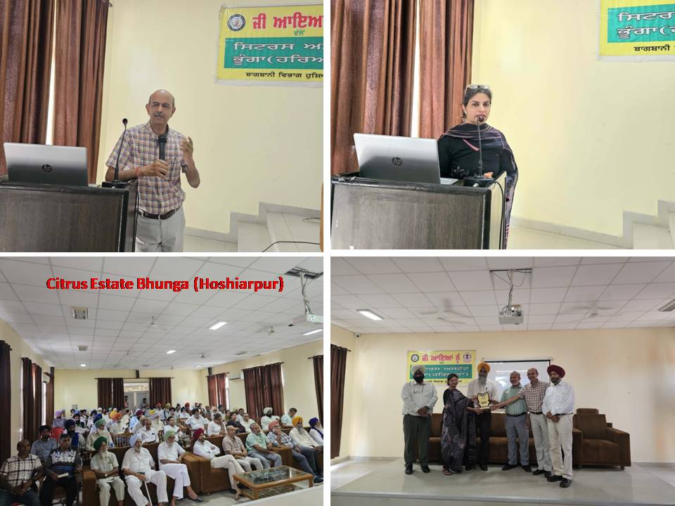 One day Technical Session on Postharvest Management of Fruits & Vegetables was organized by Citrus Estate Bhunga, District Hoshiarpur on 28-8-2024. Dr. B.V.C. Mahajan, Director PHPTC delivered expert lecture on "Role of cold chain infrastructure for minimizing the postharvest losses of fruit and vegetables". Dr. Ritu Tandon also delivered a talk on "Use of green alternative of synthetic fungicide (essential oils) to improve postharvest shelf life of Kinnow". Dr. Mahajan enlightened the progressive farmers regarding testing services available at Quality Control Laboratory of PHPTC. About 150 farmers attended the programme.
